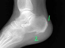 1、アキレス腱付着部または踵骨後面 2、踵骨足底部の骨棘