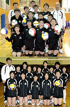 男子岡山県選抜の選手ら(写真上)、女子岡山県選抜の選手ら(写真下) 岡山県バレーボール協会は、小学生の県選抜チームを初めて結成、22日から中国・南京へ選手団を派遣し、レベルアップを図る。小学校から高校までの一貫指導でトップ選手育成につなげる強化事業の一環。都道府県単位で小学生の選抜チームをつくるのは全国でもあまり例がなく、今後の成長が期待される。